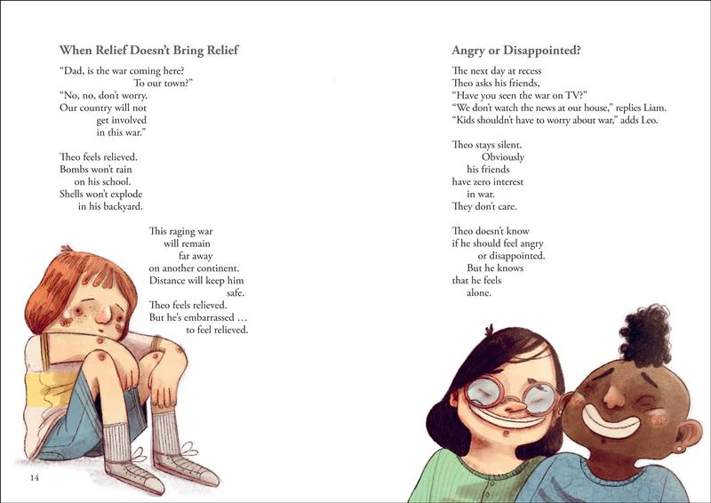 In a distant country, war is wreaking havoc. Theo, safe in his house, is horrified by the images of violence he sees on TV, and he can’t stop wondering why: Why the war? Why this senseless violence? Why so much hate? His dad says it’s complicated, and has no real answers to give him. His friends at school say that kids shouldn’t be worried about faraway wars. But Theo can’t stop thinking about bombs destroying houses and schools. He starts to feel very, very alone.