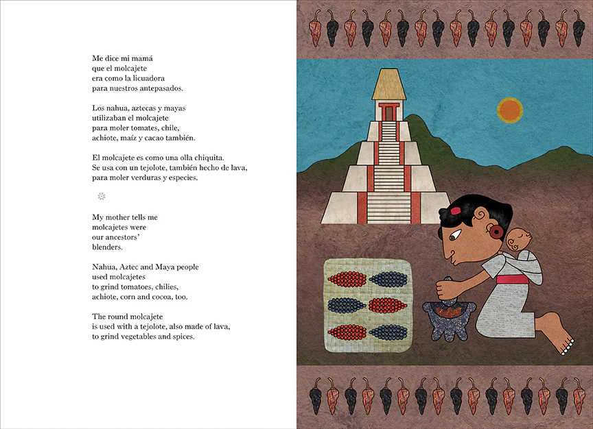 A young boy and his sister gather the ingredients and grind them up in a molcajete, just like their ancestors used to do, singing and dancing all the while.